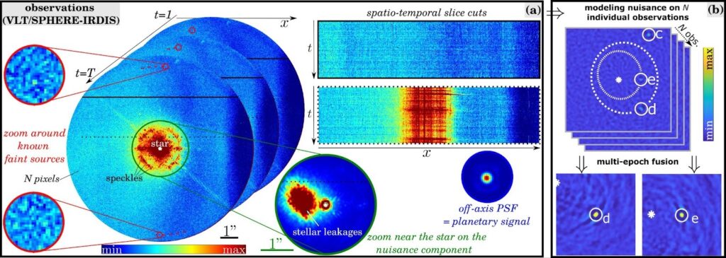 Scientific Context: The direct observation of the close environment of stars can reveal the presence of exoplanets and circumstellar disks, providing crucial insights into the formation, evolution, and diversity of planetary systems [1]. Given the very small angular separation with respect to the host star and the huge contrast between the (very bright) star and the (very faint) exoplanets and disks, imaging the immediate vicinity of a star is extremely challenging. To overcome these difficulties, advanced observational techniques are used. They include (i) extreme adaptive optics, which compensates in real time for wavefront distortions caused by atmospheric turbulence; (ii) coronagraphy, which partially blocks the star light; and (iii) observing strategies which introduce diversity among the different signals to be unmixed [2]. Dedicated processing methods that combine the recorded spatio-temporo-spectral image series form the last corner-stone of direct imaging and they aim to efficiently suppress the nuisance component (i.e., speckles and noise) corrupting the signals of interest [3]. In this context, data science developments are decisive to improve the detection sensitivity of exoplanets and the accuracy of their physical characterization.