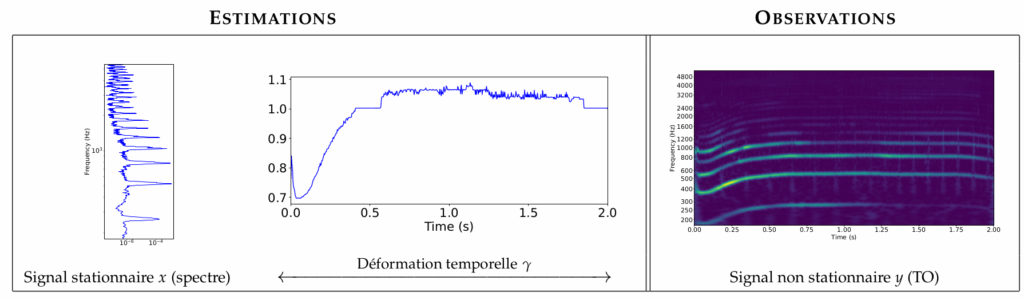 Nous nous intéresserons au signaux pour lesquels la déformation temporelle varie rapidement, causant l’apparition d’interférences dans les représentations classiques. Nous définirons un modèle non linéaire destiné à construire une représentation exempte d’interférences. Il reposera sur un réseau neuronal dont les sorties seront assimilables à des coefficients TF, contraints pour respecter la structure d’une représentation TF idéale. Nous intégrerons explicitement, comme a priori, la propriété de déplacement des coefficients observée dans la TO lors de variations de hauteur. L’objectif est que la nouvelle représentation conserve cette structure, y compris lorsque la déformation temporelle devient trop rapide pour les méthodes classiques. Une étape de reconstruction linéaire permettra ensuite de synthétiser le signal à partir de ces coefficients, formant ainsi un problème d’apprentissage autosupervisé.